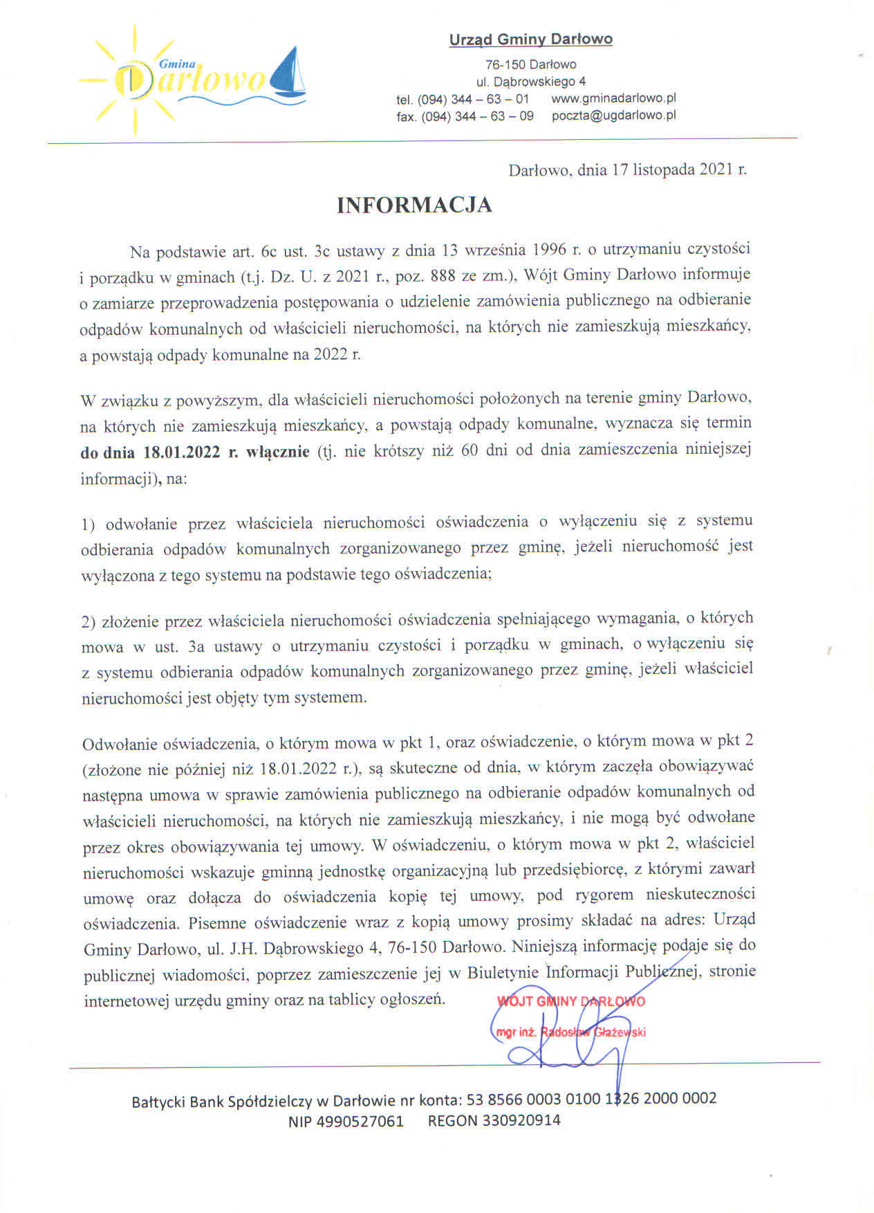 W związku z powyższym, dla właścicieli nieruchomości położonych na terenie gminy Darłowo, na których nie zamieszkują mieszkańcy, a powstają odpady komunalne, wyznacza się termin do dnia 18.01.2022 r. włącznie (tj. nie krótszy niż 60 dni od dnia zamieszczenia niniejszej informacji), na: